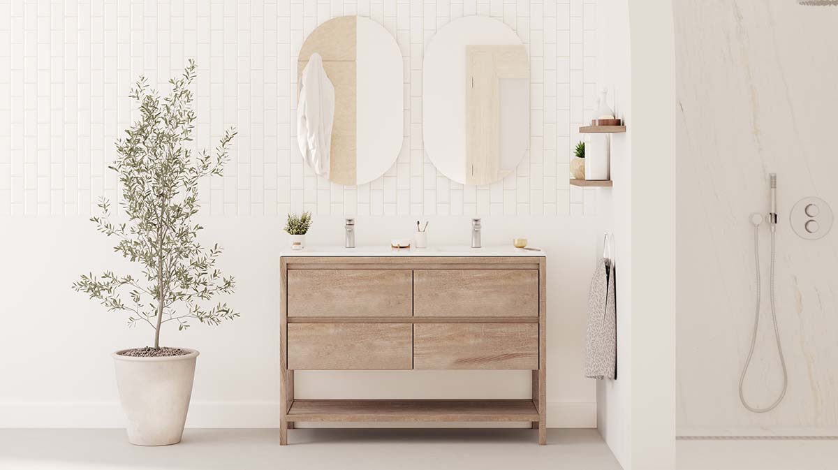 Elea, a compact and stylish bathroom set with storage, ceramic basin, and mirror