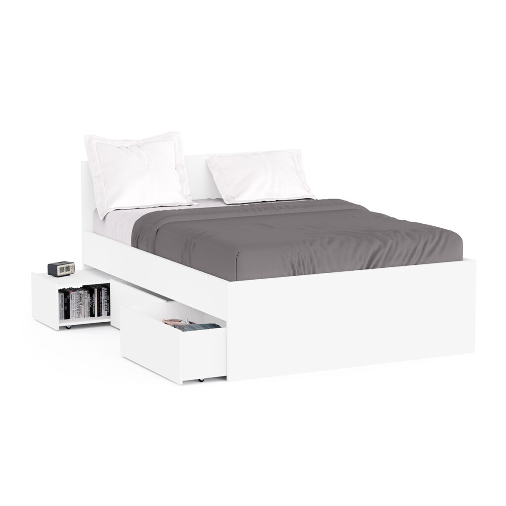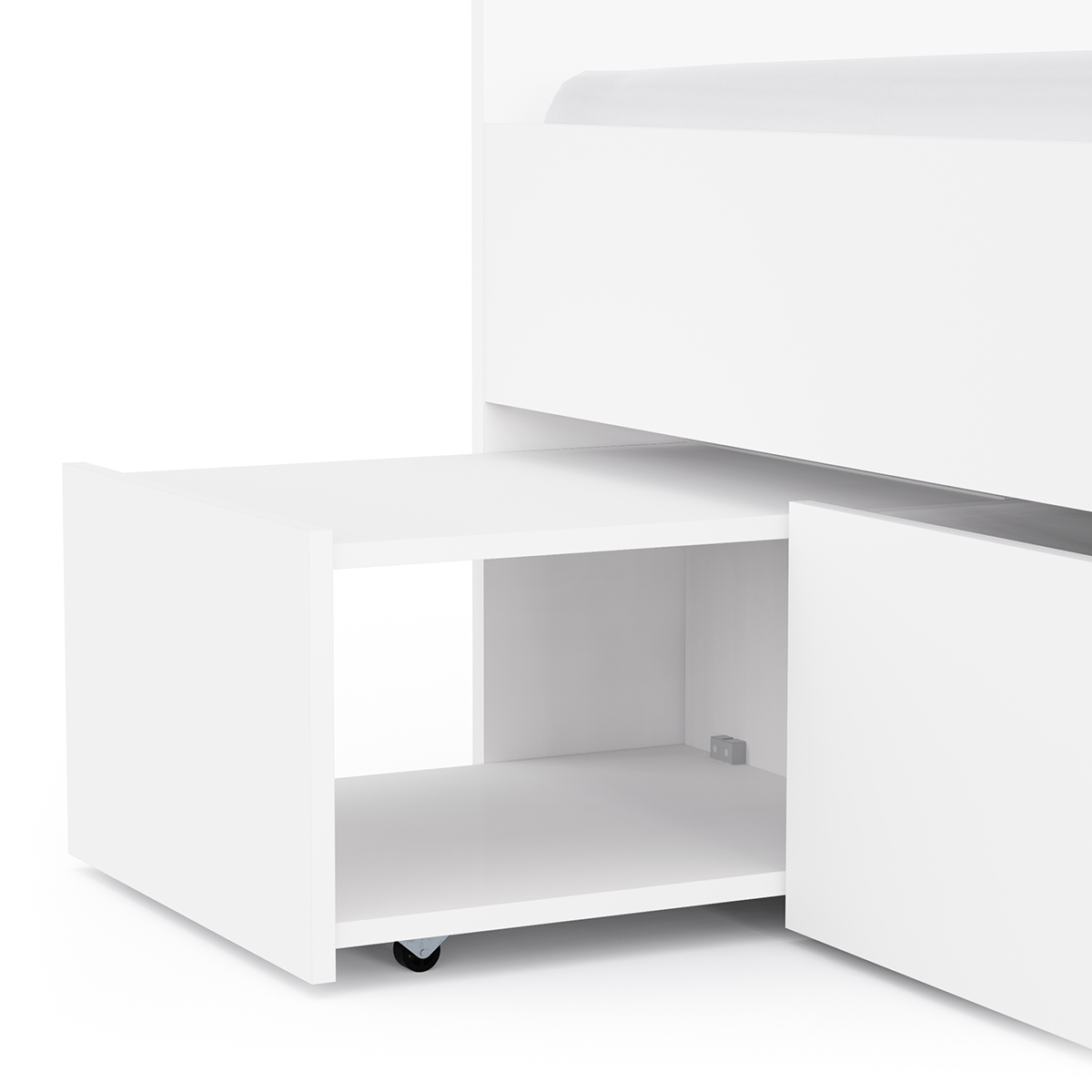 • Includes 3 drawers on steel castors (one acts as a bedside table) + integrated pull-out bed