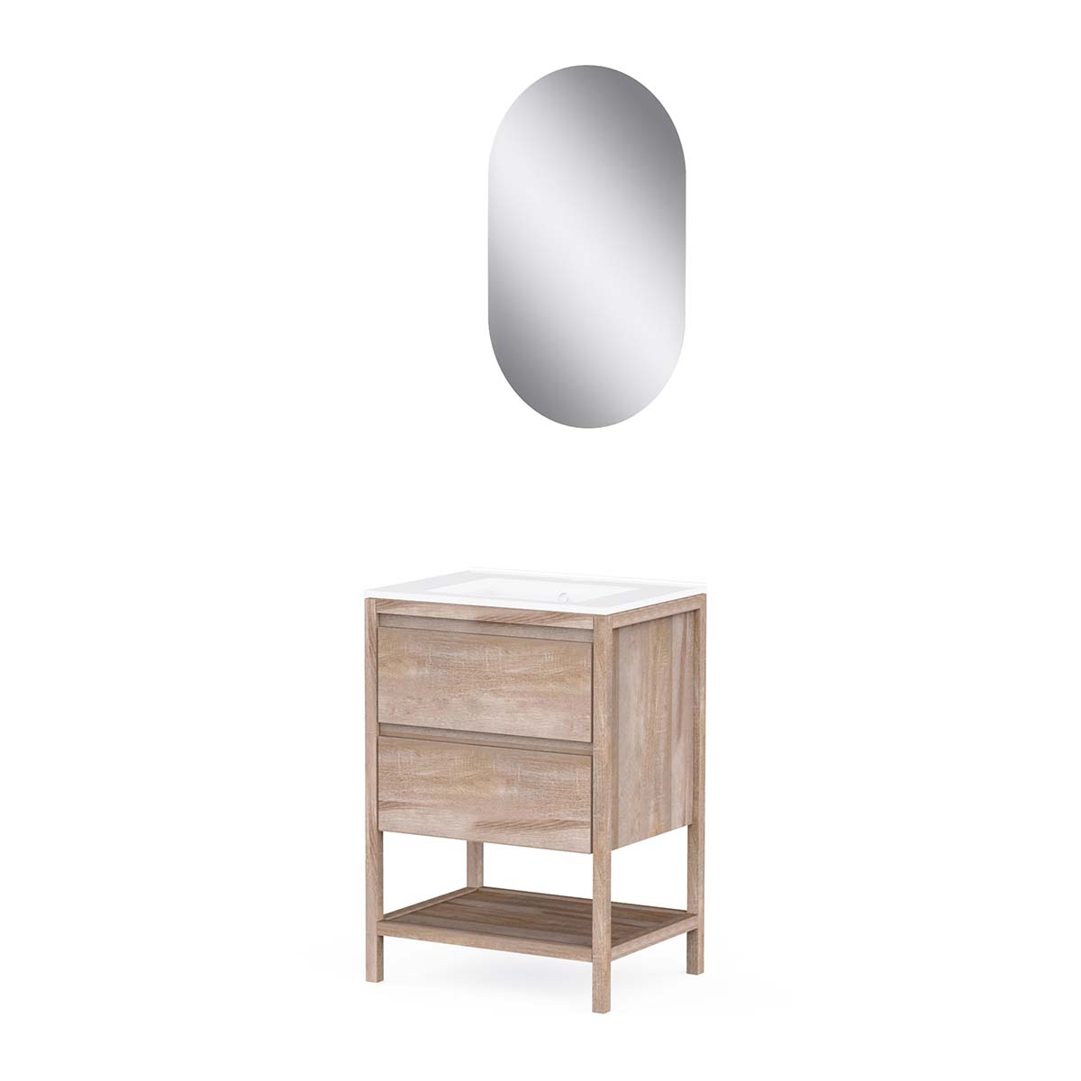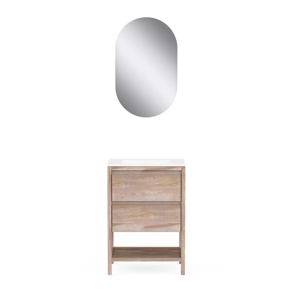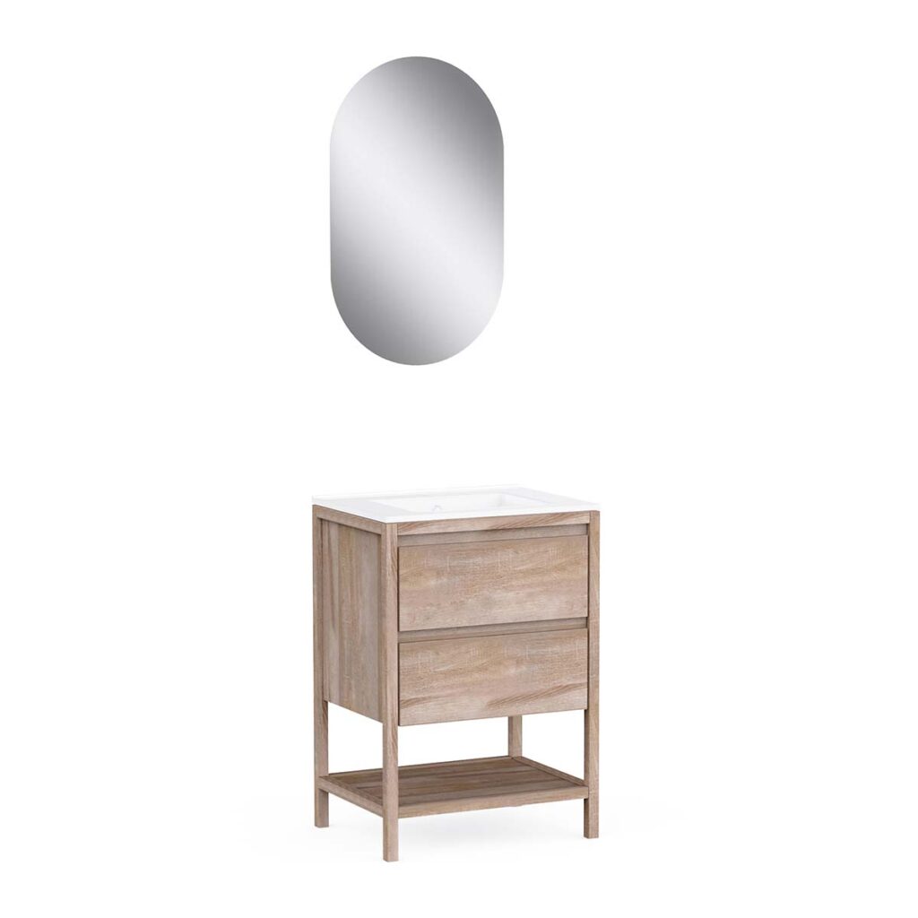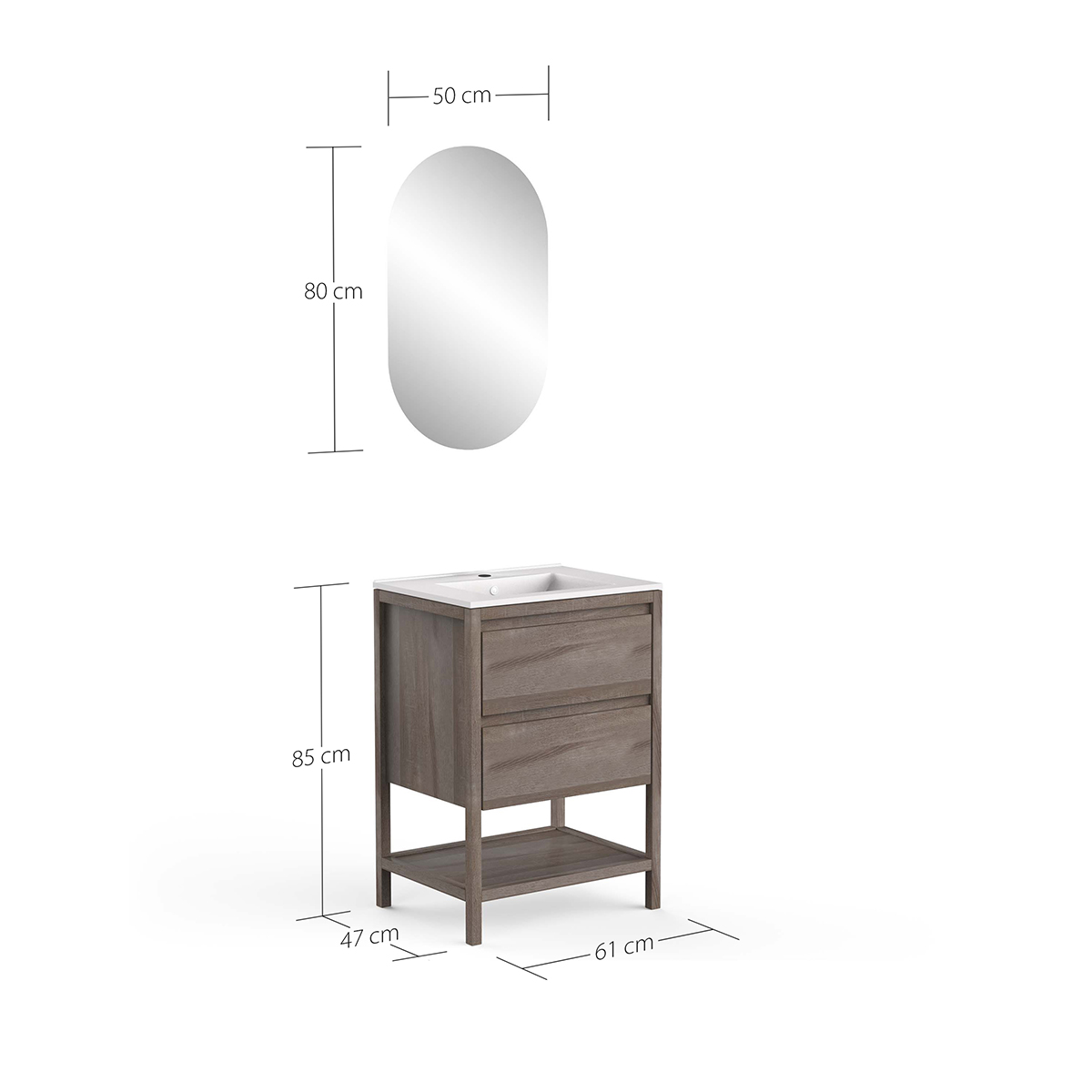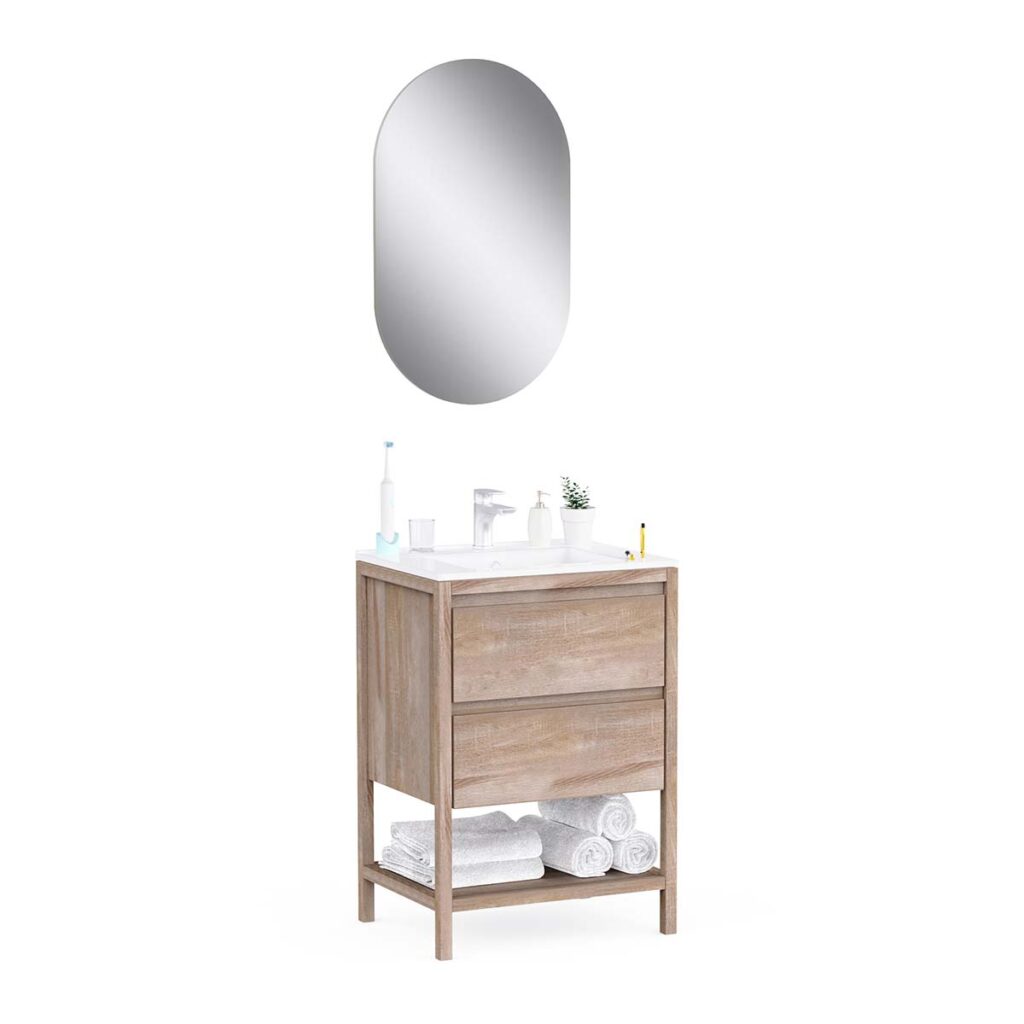 • 2 soft-close drawers + 1 open niche + single ceramic basin + L50 x H80 cm mirror