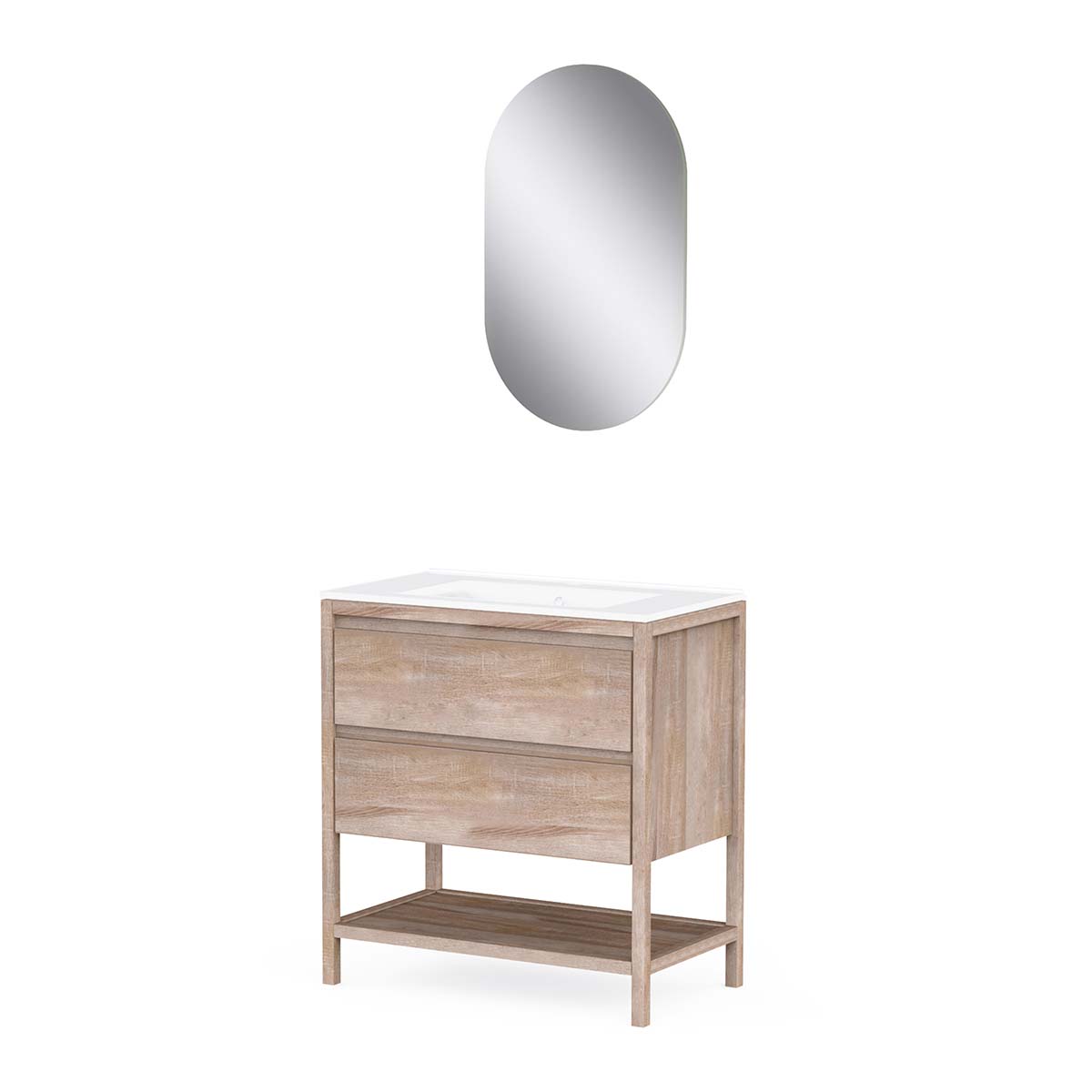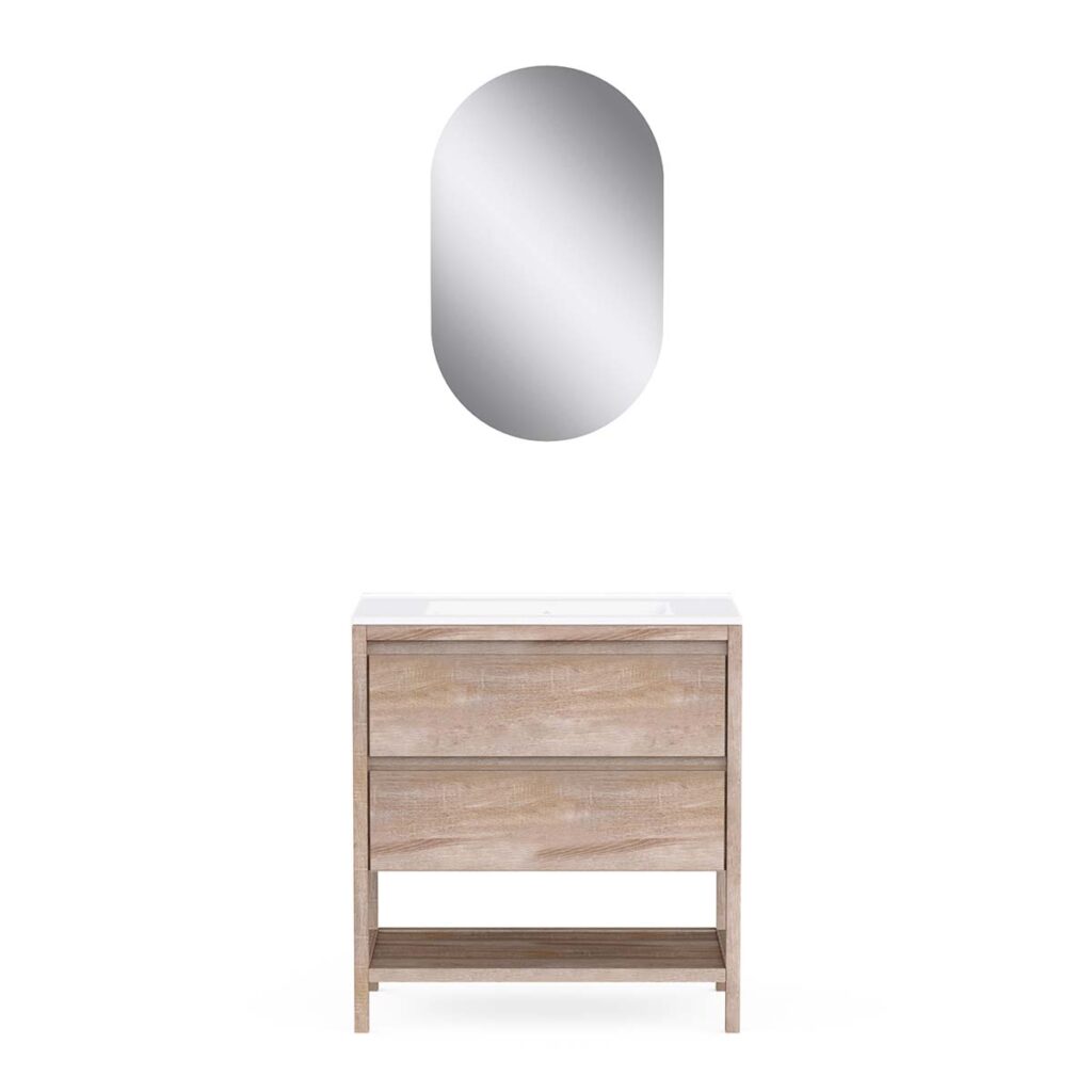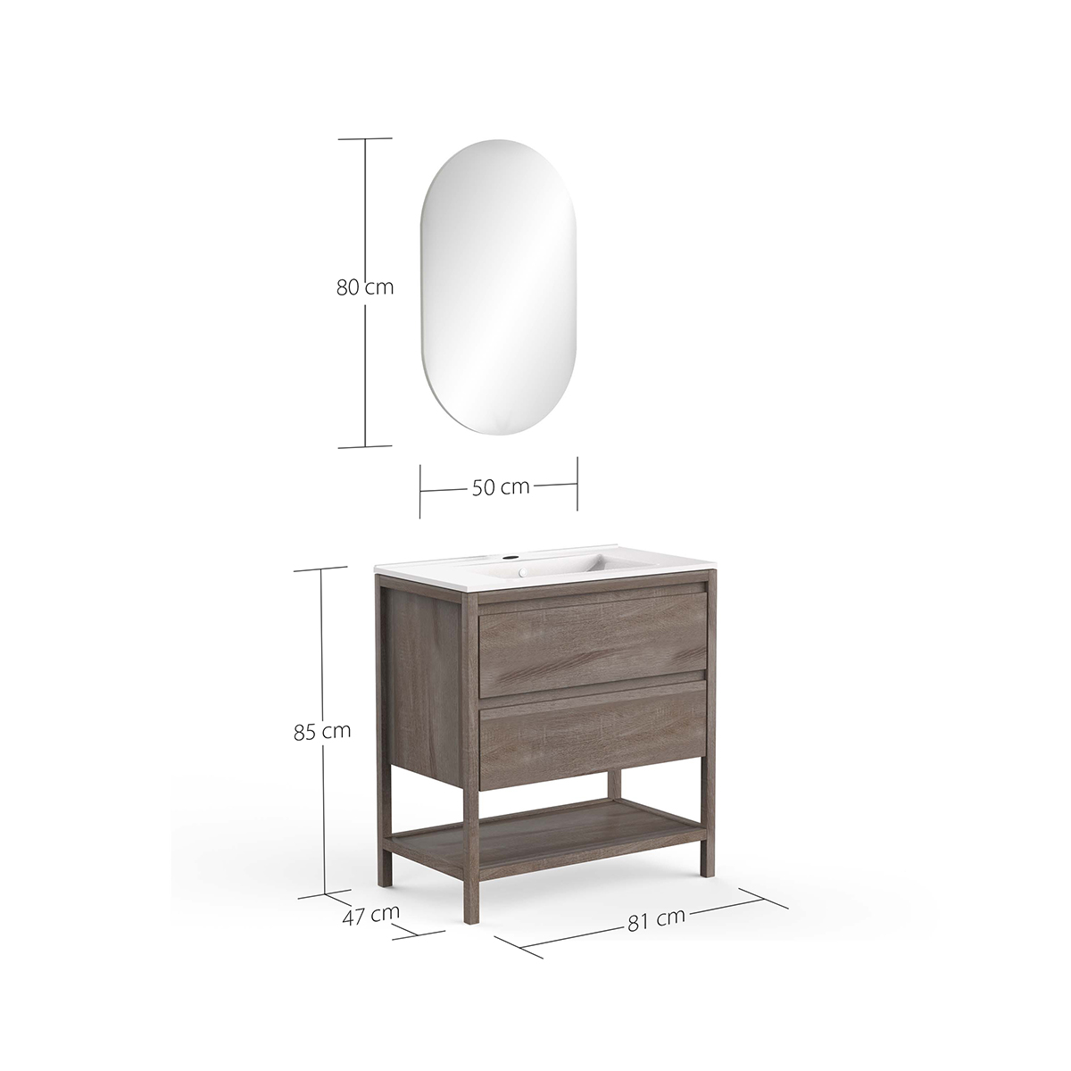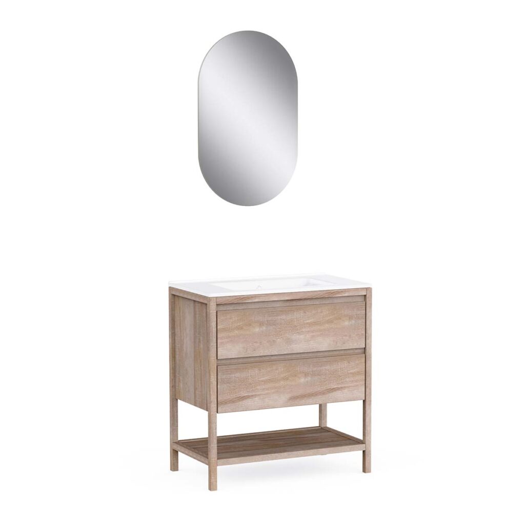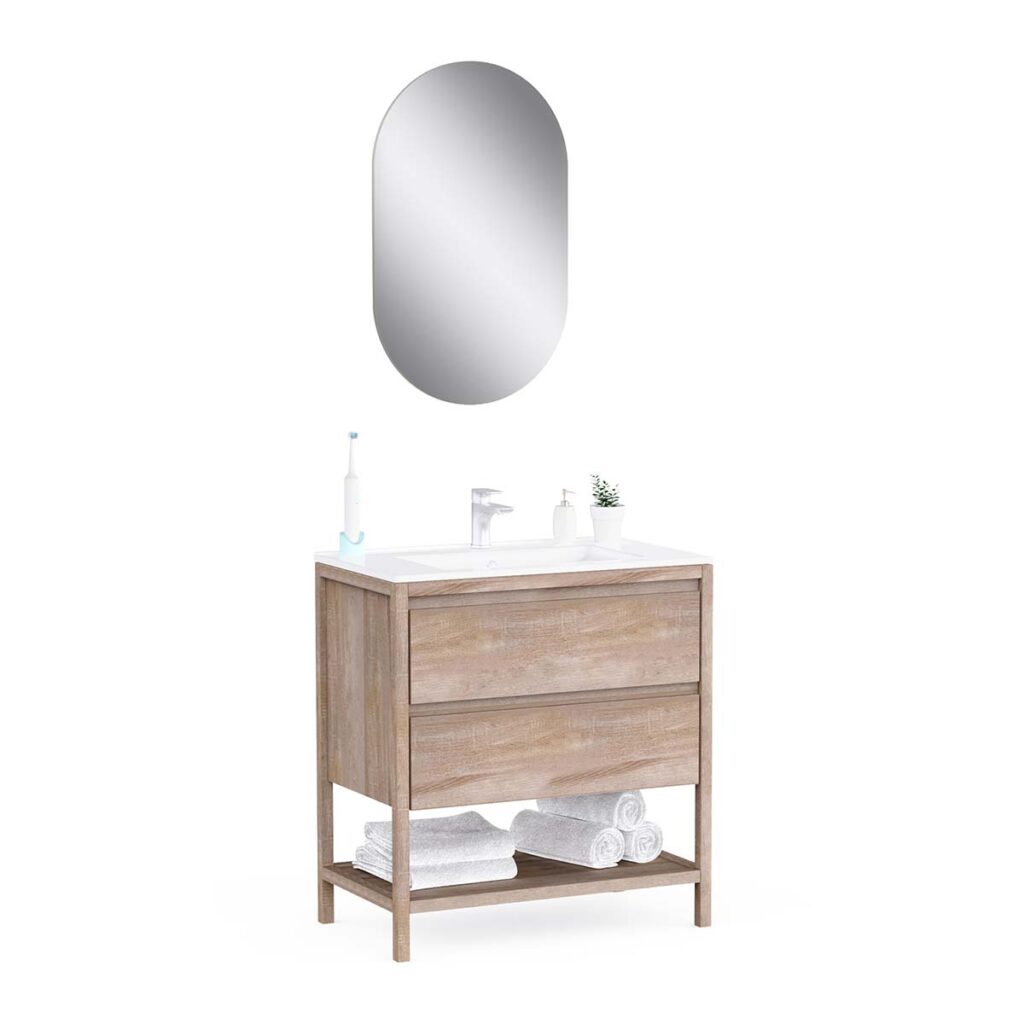 • 2 soft-close drawers + 1 open niche + single ceramic basin + L50 x H80 cm mirror
