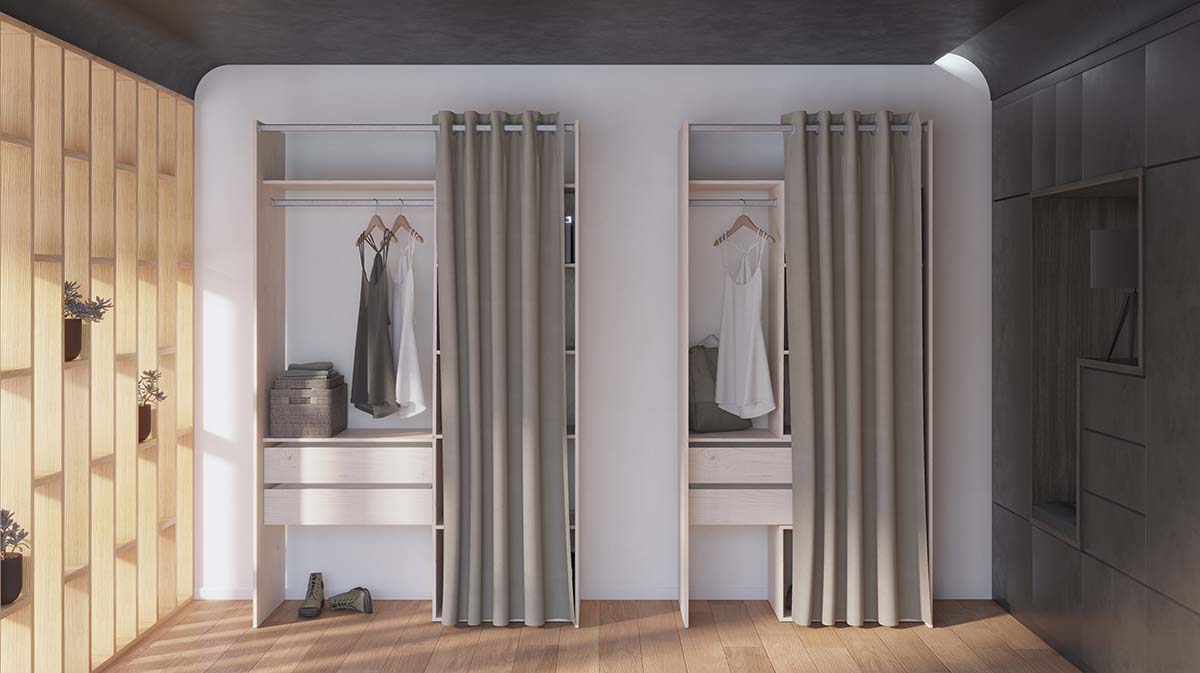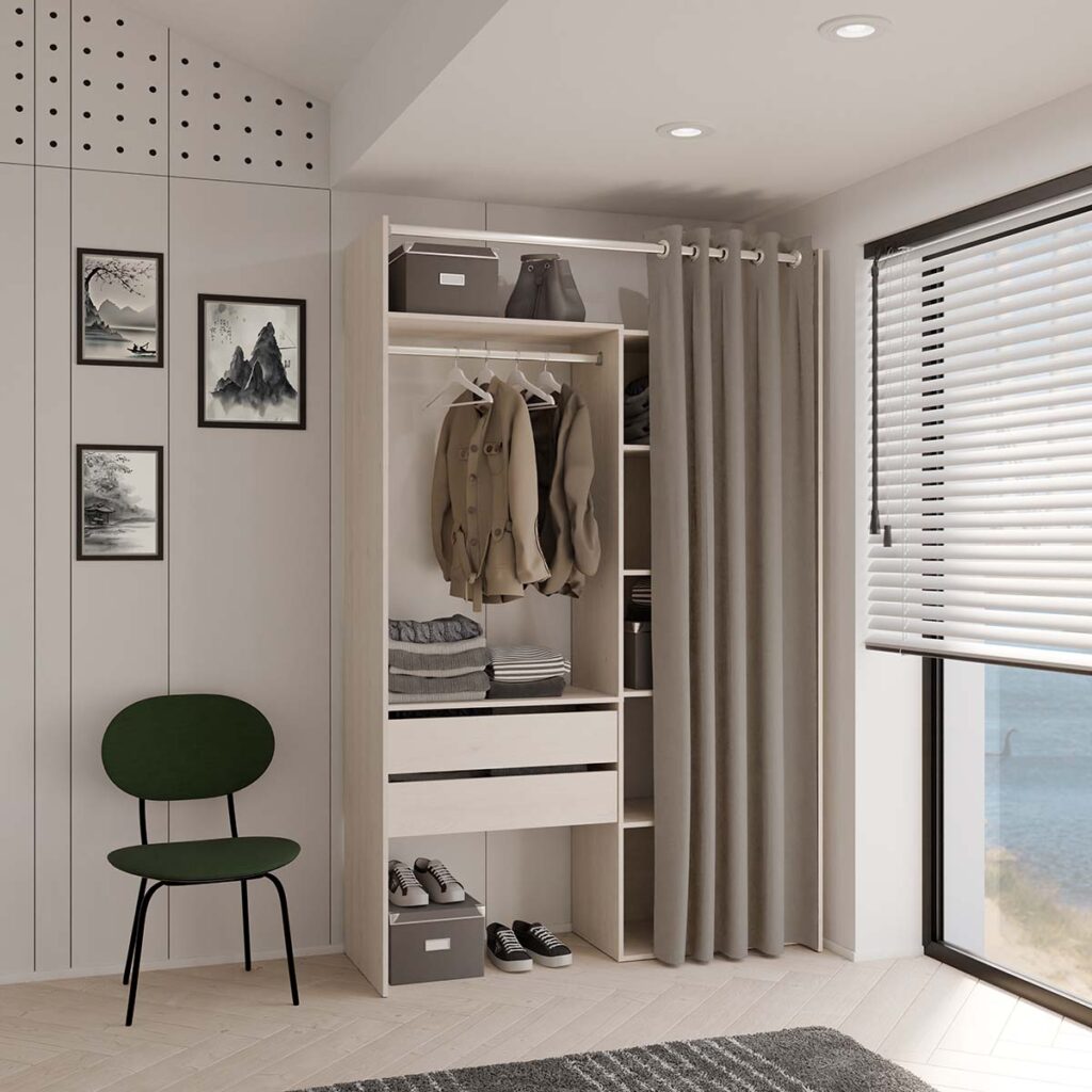 The UNIK collection offers smart and compact wardrobe kits in a warm Topanga hazel finish. With drawers, shelves, and a sturdy hanging rail, each unit provides practical, well-organized storage for everyday needs